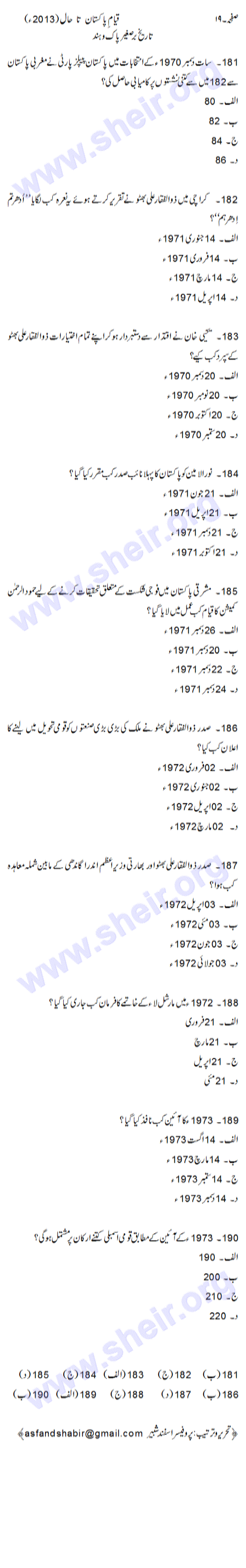 Pakistan Studies Multiple Choice Questions (MCQs) in Urdu. The following MCQs are from the creation of Pakistan up to the year of 2013.