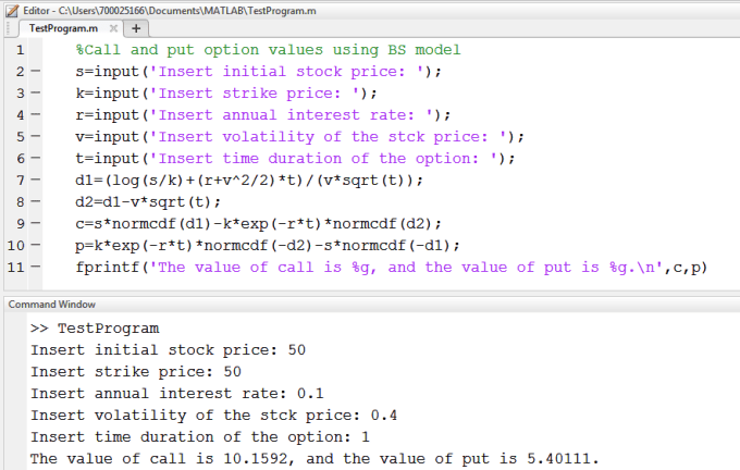 Write a script file where the program ask user to insert stock price, strike, interest rate, volatility, and time. And it should display the European style call and put option values in the style,