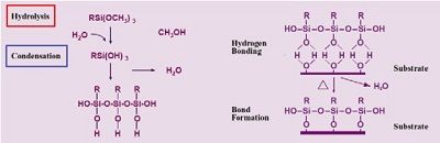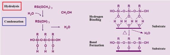 Organosilanes requires the silane molecule to undergo hydrolysis and condensation reactions for any application. Unlike the C-H bond, the silicon hydride (Si-H) structure is reactive towards the water to form reactive silanol (Si-OH) species. Depending on the nature of the hydrolyzable groups attached to the silicon, it may distinguish into following categories of silanes: chlorosilane, silazanes, alkoxysilanes, and a cyloxysilanes. Because organosilanes hydrolyze before reacting with each other or with the hydroxyl groups present on a substrate surface, it is important to understand the reaction kinetics. The hydrolysis reaction can be catalyzed using either an acid or a base by SN2 reaction mechanism where pentacoordinate intermediates are studied. Mechanisms of acid- and base- catalyzed hydrolysis of organosilanes have been extensively by NMR and x-ray crystallography. The rates of both hydrolysis and condensation are influenced by changing pH levels. However, the optimum pH for hydrolysis is not optimum for condensation. Finding the best balance between hydrolysis and condensation is one of the keys to the successful utilization of organosilane chemistry for a particular application.